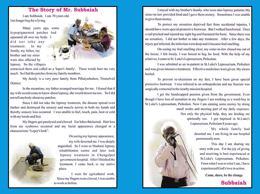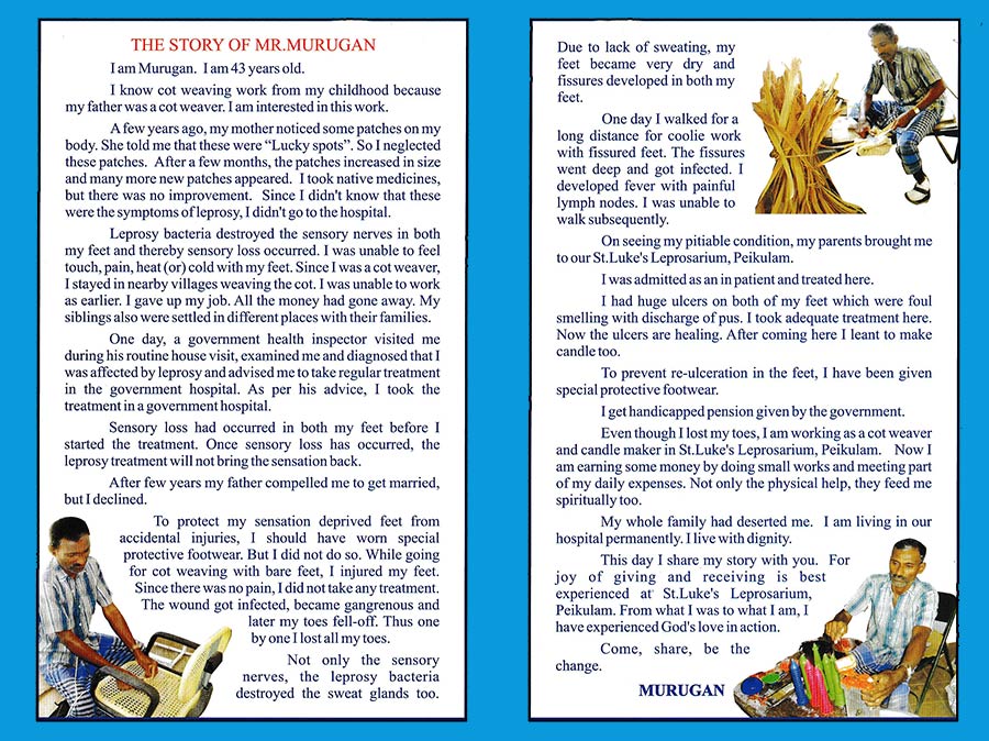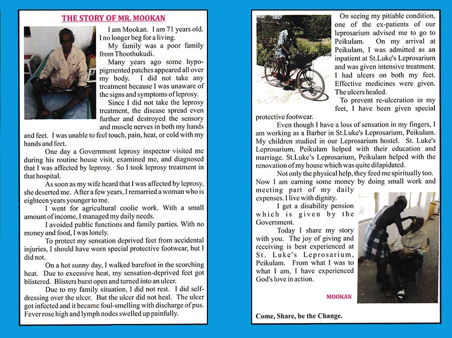 Mr. Mohammed Yoosuf belongs to Paththamadai in Tirunelveli District, Tamil Nadu. Paththamadai is famous throughout India for mat-weaving. When Mohammed Yoosuf was about 25 years old, some patches appeared on his body. At that time he was a cloths merchant in Trichy. He did not know that, these were the symptoms of leprosy. After a few months, the patches grew in size and number. So he went to Trichy Government Hospital. There the doctor examined him and gave leprosy treatment and advised him to continue the treatment for two years.