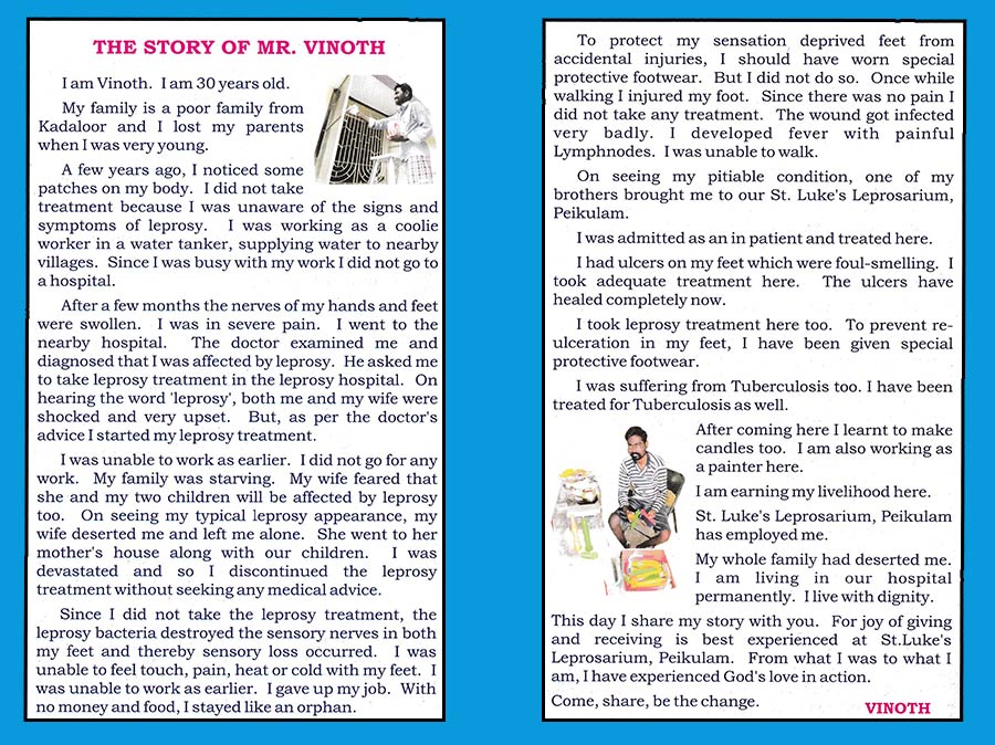 My name is Anthony Savarimuthu. I was a leprosy patient. But now, if you see my face and hands, you cannot make out that I was once affected by leprosy. I am very much thankful to St. Luke's Leprosarium, which has brought me a new hope in my life. I am from a poor family. My father was a toddy-tapper. When I was 11 years old, my left leg got paralysed suddenly (Foot-drop due to leprosy). I went to St. Luke's Leprosarium. They gave intensive treatment, including POP cast and physiotherapy exercises. A few months later, I had reconstructive surgery, which corrected my foot-drop. Now I am able to walk and am almost normal.